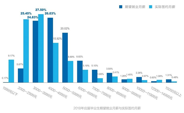 整体来看,2018年应届毕业生的期望就业月薪主要集中在4,000—4,999元以及3,000—3,999元,占比分别为26.03%和24.83%,而实际签约月薪主要集中在3,000—3,999元和2,000—2,999元,占比分别为27.5%和25.45%。和期望值相比,实际签约月薪整体下降一档。