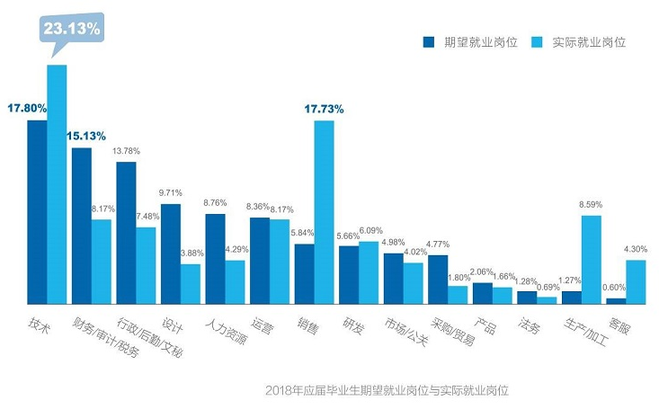 在2018年应届毕业生的就业岗位当中,技术类岗位无论期望签约占比还是实际就业占比依旧最高。其中,期望就业占比为17.80%,同比上升1.10%,实际就业占比为23.13%,同比上升4.33%,实际签约人数明显超过期望签约人数。
