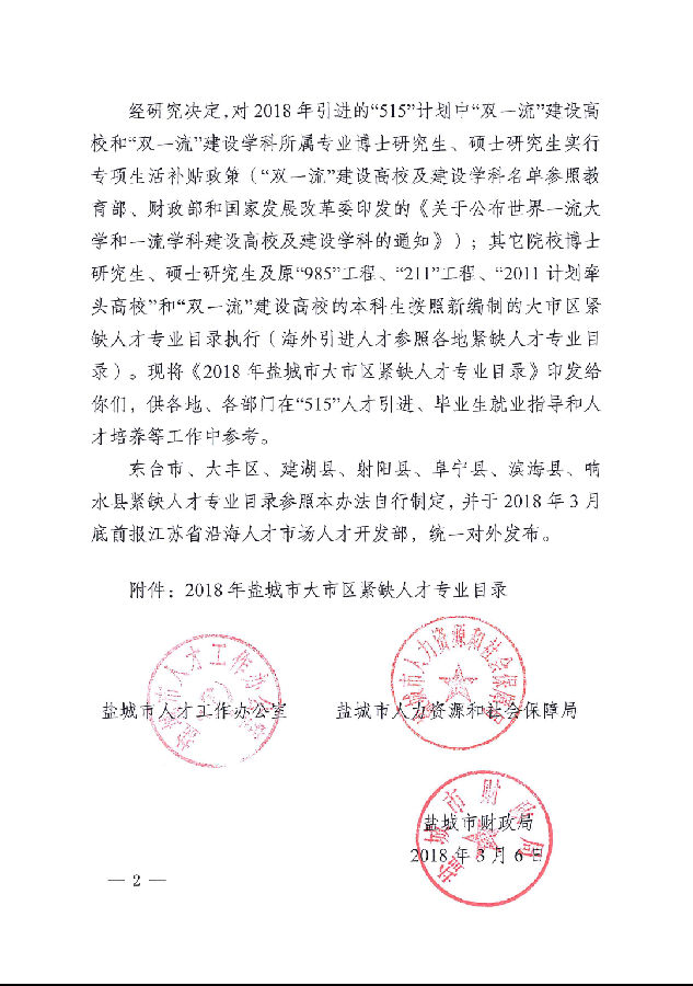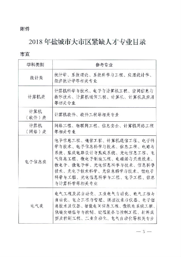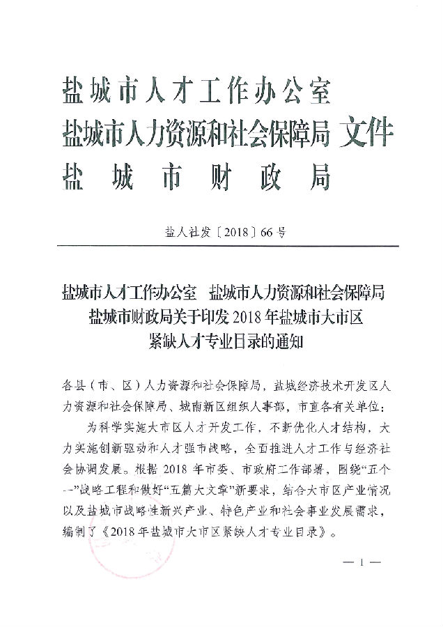 人才办 人社局 财政局(盐人社发[2018]66号)关于印发2018年盐城市大市区紧缺人才专业目录的通知